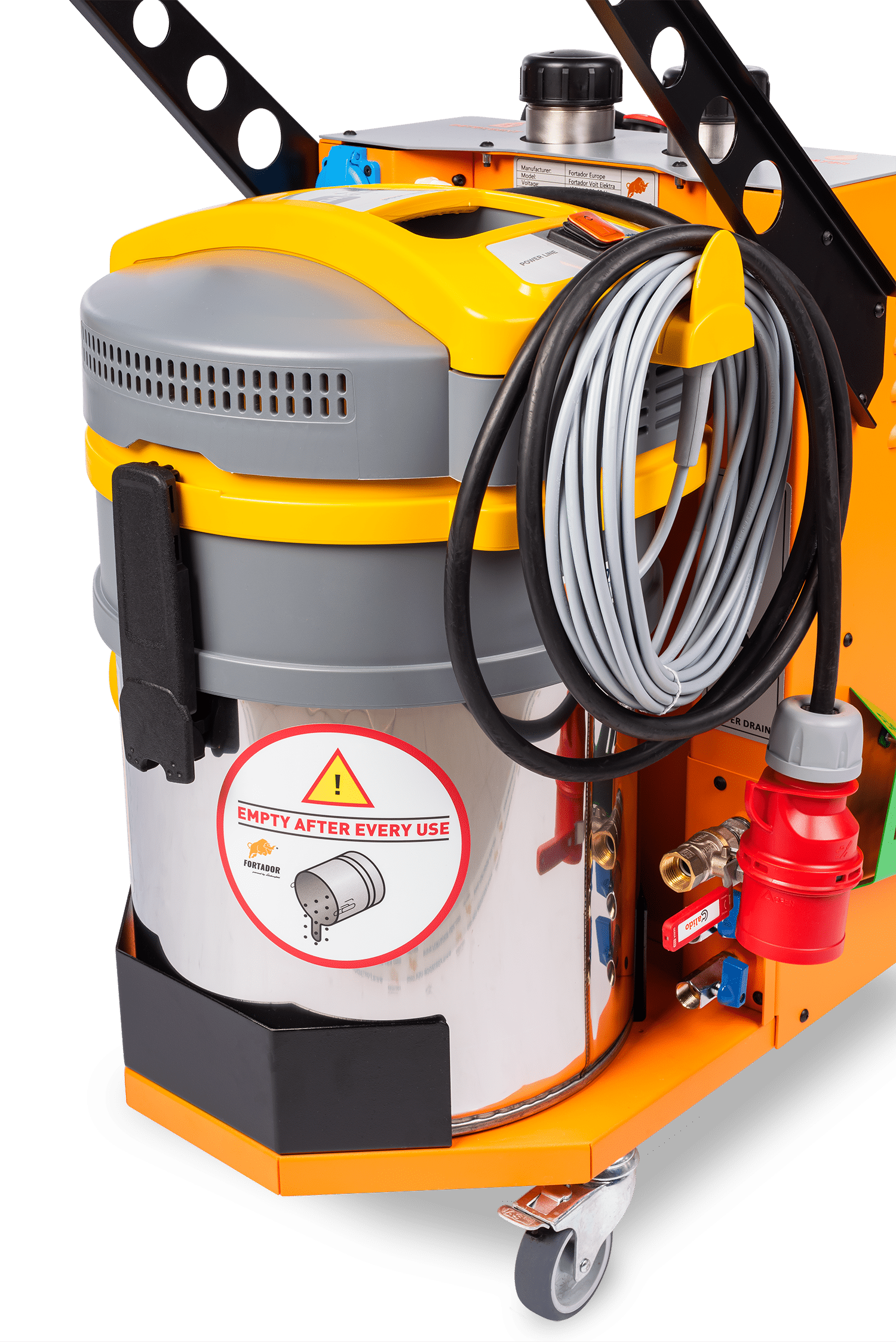 De Fortador Volt Electra is uitgerust met extractie, waardoor losgekomen vervuiling, condens en restvocht direct kunnen worden afgezogen. Dit zorgt voor een schoner eindresultaat en snellere droogtijden, wat vooral belangrijk is in omgevingen waar doorlooptijd en hygiëne kritisch zijn.